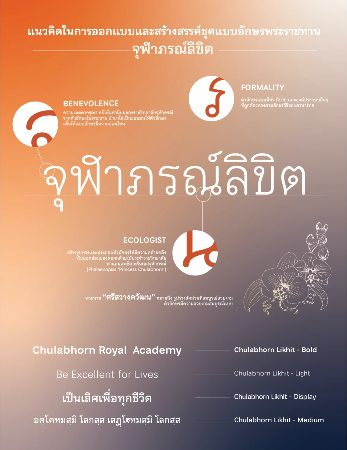 ชุดแบบอักษรไทยที่มีโครงสร้างมาตรฐานถูกต้องตรงตามอักขรวิธี ลายเส้นอ่อนช้อยสวยงาม และชุดแบบอักษรภาษาอังกฤษตามมาตรฐานสากล สามารถใช้ได้กับทุกโอกาสทุกวาระ ทั้งในเอกสารทั่วไปและในข้อความพาดหัว